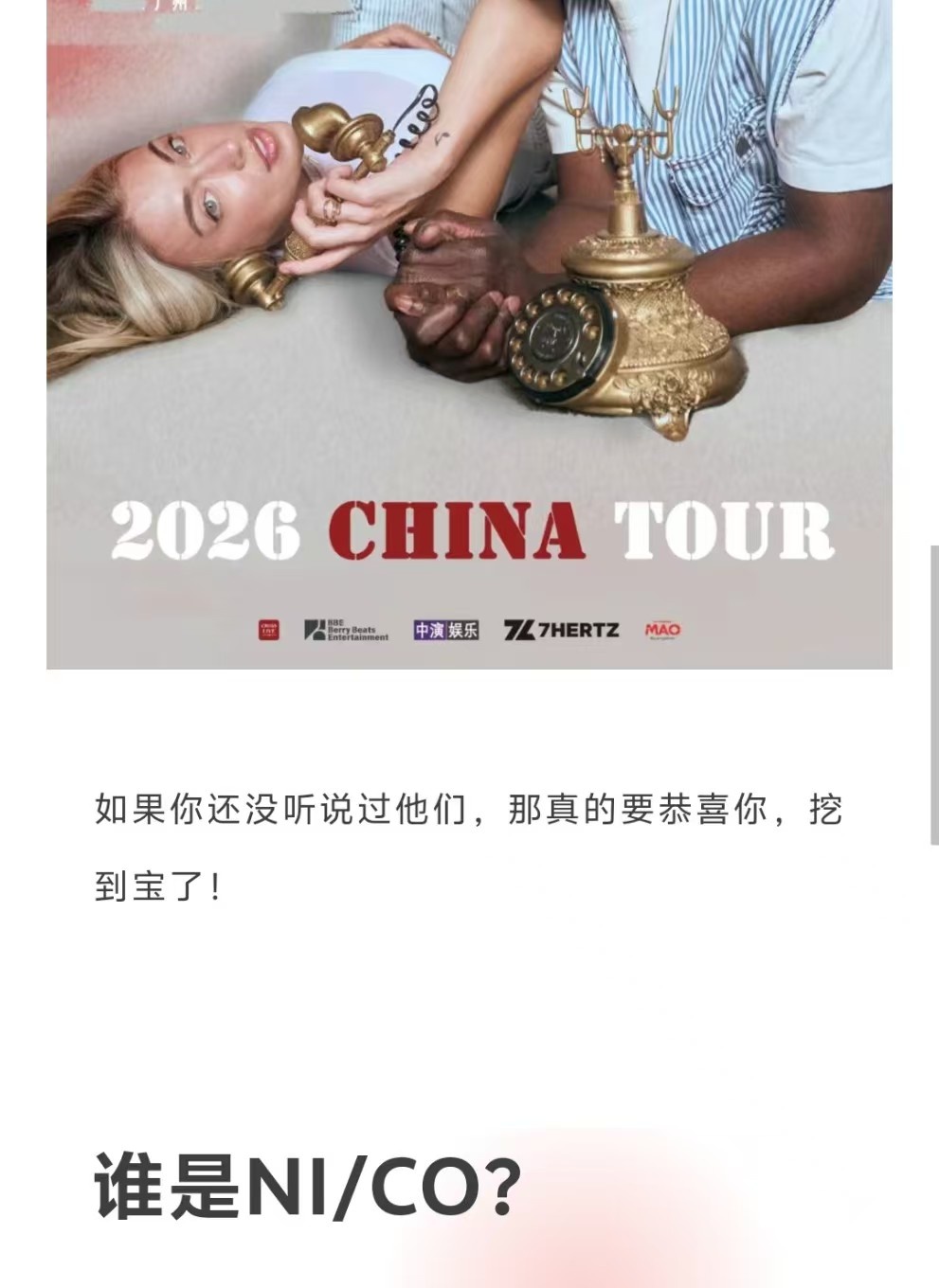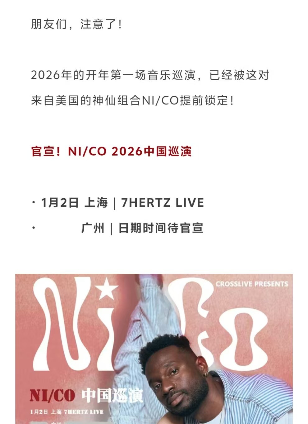 演出名称:【上海】Ni/Co 2026 上海演唱会【网上订票】演出时间:2026.01.02 周五 19:30