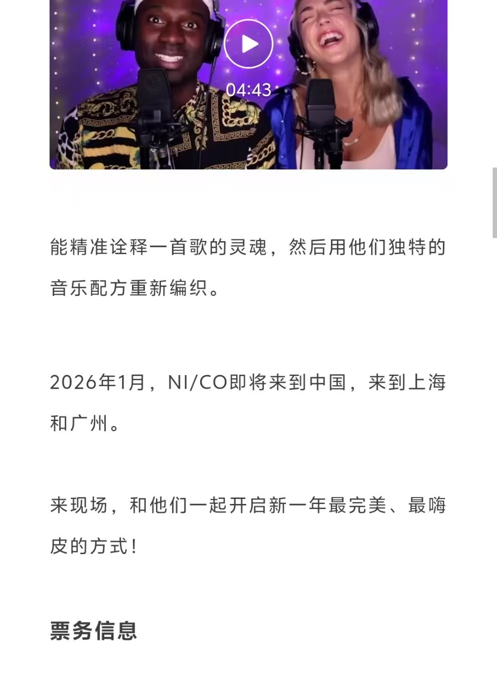 【上海】Ni/Co 2026 上海演唱会【网上订票】门票怎么买?目前国内较有影响的票务平台有大麦网,购票通,中购票务,娱乐票务,猫眼票务,摩天轮票务,中票在线,聚橙票务,淘票票,票牛票务,票星球等多达上百家,其中有一级票务代理平台,也有二级票务代理平台,通过这些平台都可以买【上海】Ni/Co 2026 上海演唱会【网上订票】的门票。用户可对比多个平台,选择适合自己的平台购买。3、【上海】Ni/Co 2026 上海演唱会【网上订票】演出介绍: