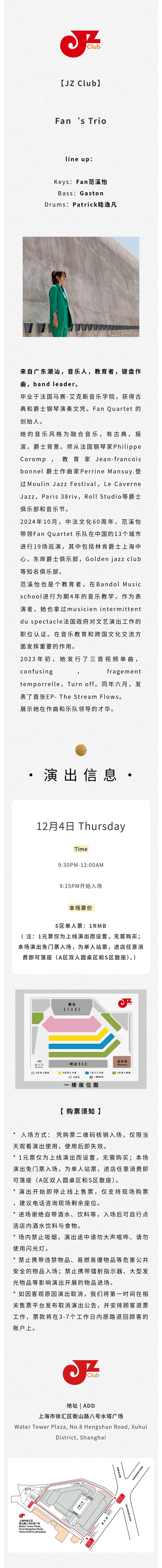中国购票通(goupiaotong.cn)【上海】【JZ Club】Fan‘s Trio将于2025.12.04 周四 21:30在JZ Club爵士上海俱乐部上演,中国购票通为【上海】【JZ Club】Fan‘s Trio门票推荐平台,更多门票价格及订票详情请咨询中国购票通。