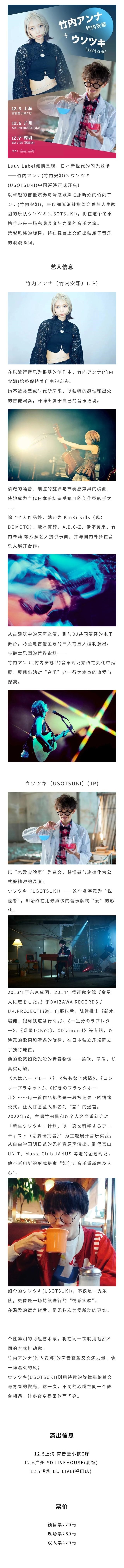 演出名称:【上海】日本人气唱作人 竹内安娜 × USOTSUKI 巡演 上海站【网上订票】