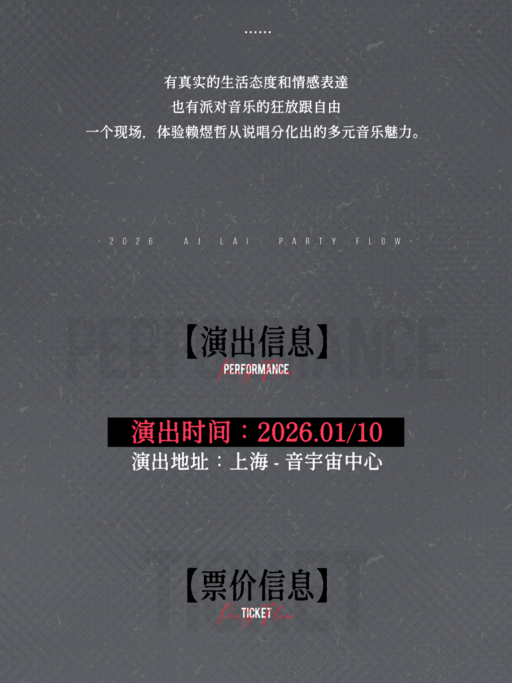 演出名称:【上海】赖煜哲《PARTY FLOW(流动派对)》2026巡回演唱会-上海站【网上订票】演出时间:2026.01.10 周六 19:30