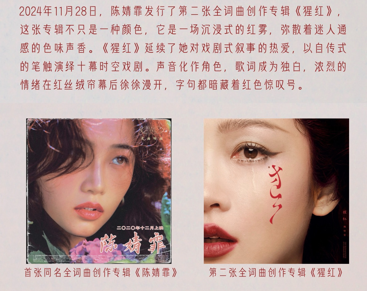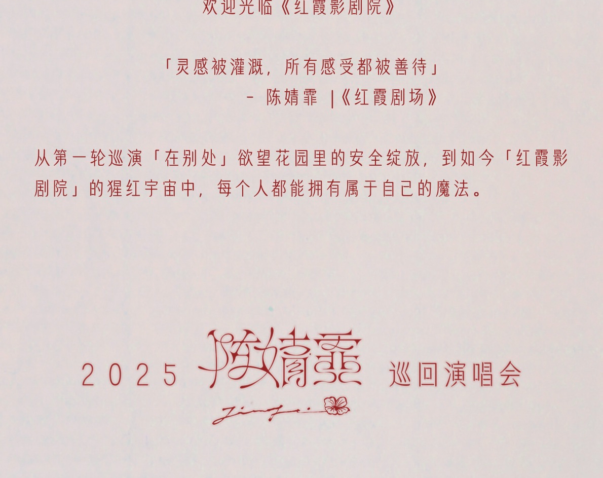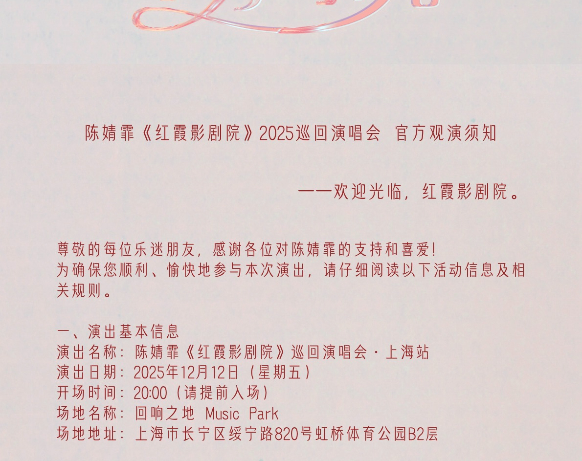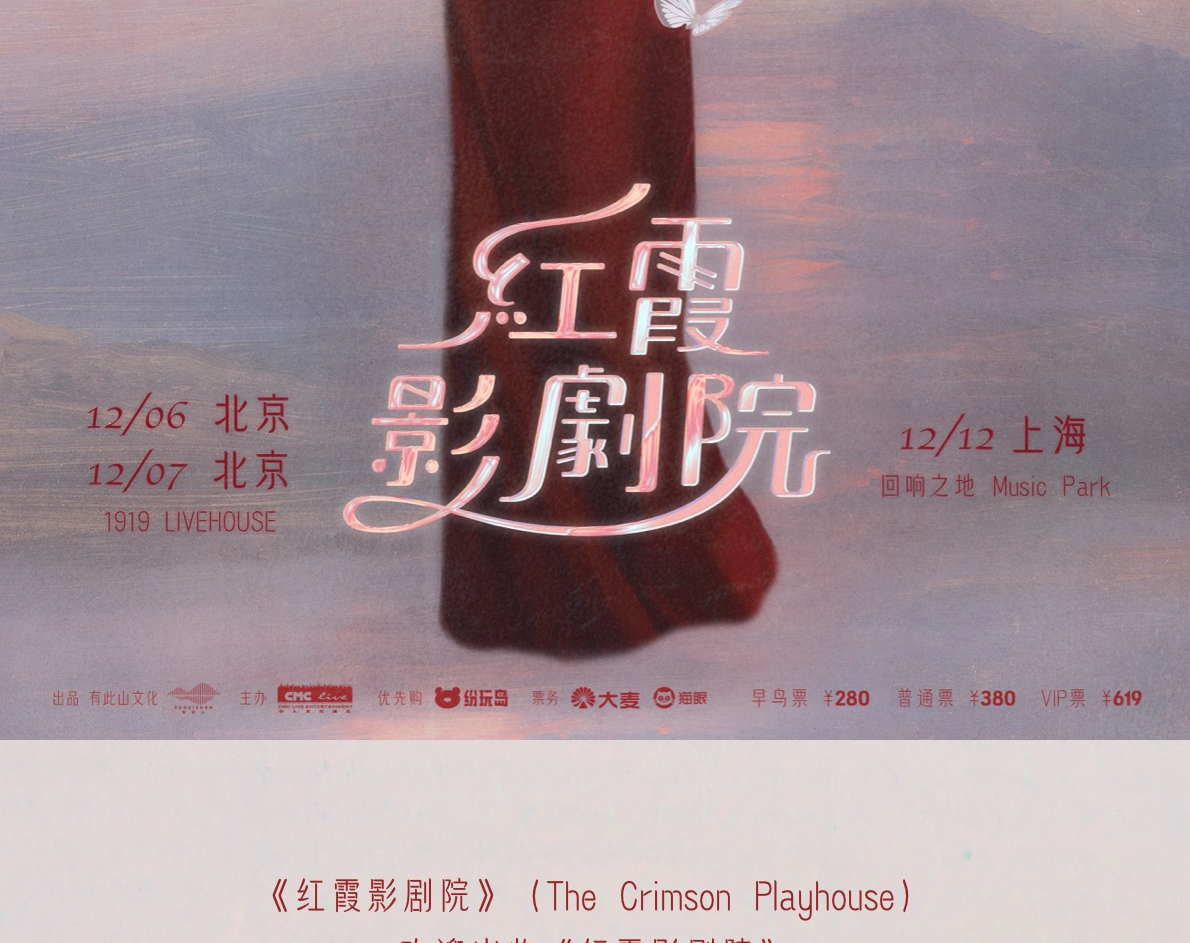 演出名称:【上海】陈婧霏《红霞影剧院》巡回演唱会 上海站【网上订票】演出时间:2025.12.12 周五 20:00