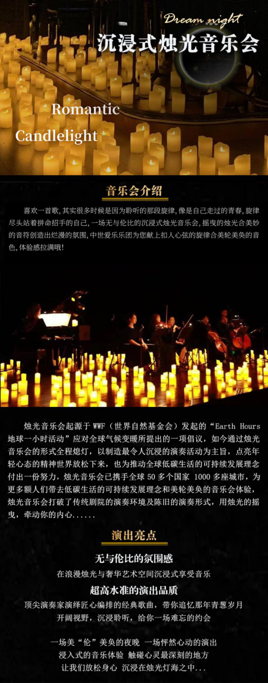 沉浸式烛光音乐会,“关于你的一切”奏响在您的面前!让感情迅速升温,让此刻浪漫成为永久的美好回忆……