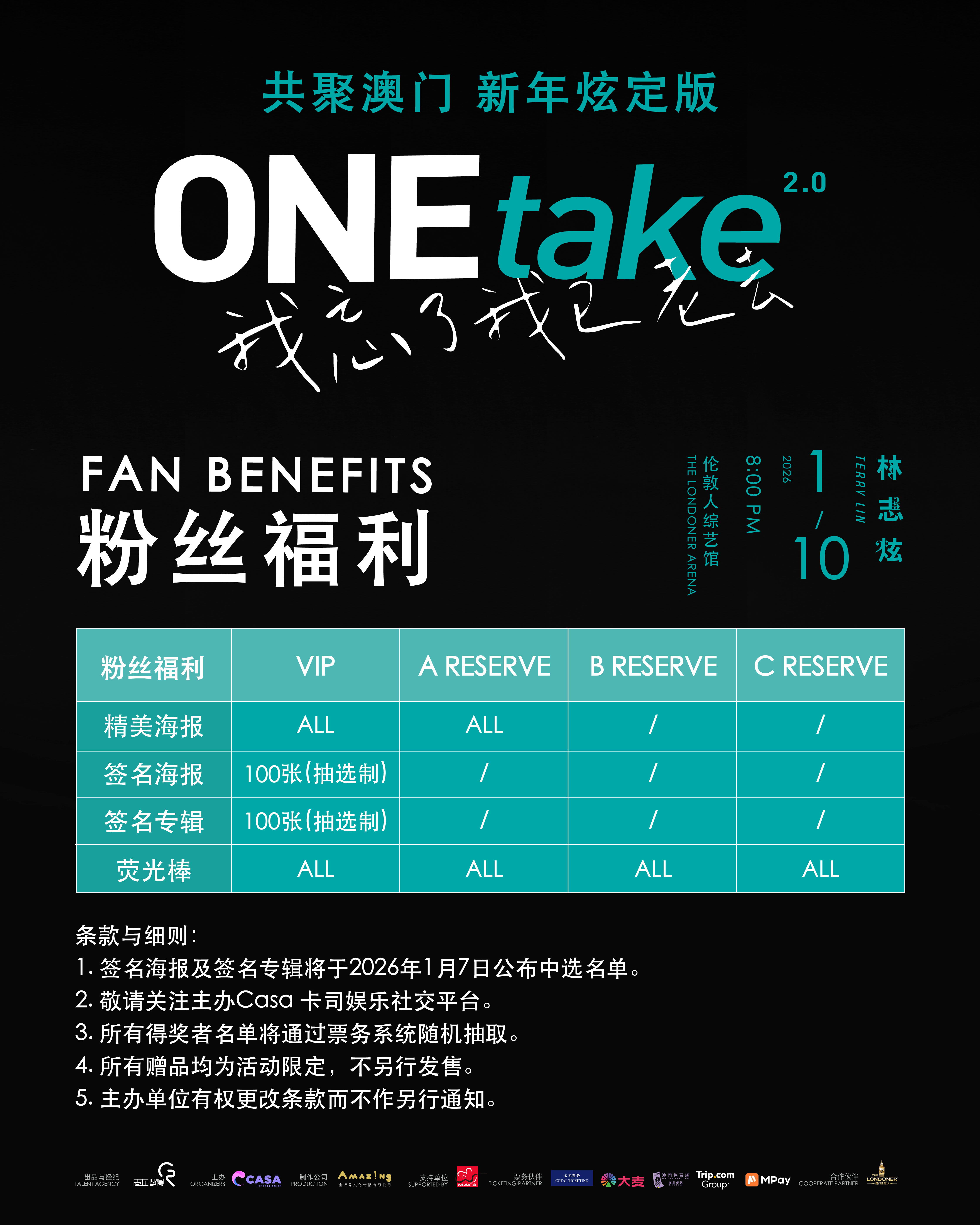 本项目门票不支持退换,一人一票,入场时必需持有有效门票。购票成功的客户,请您提前办理好港澳通行证-中国澳门签注。门票将于演出前一周左右寄出。当天如出现遗失或忘带门票情况不予处理,感谢您的支持与理解。