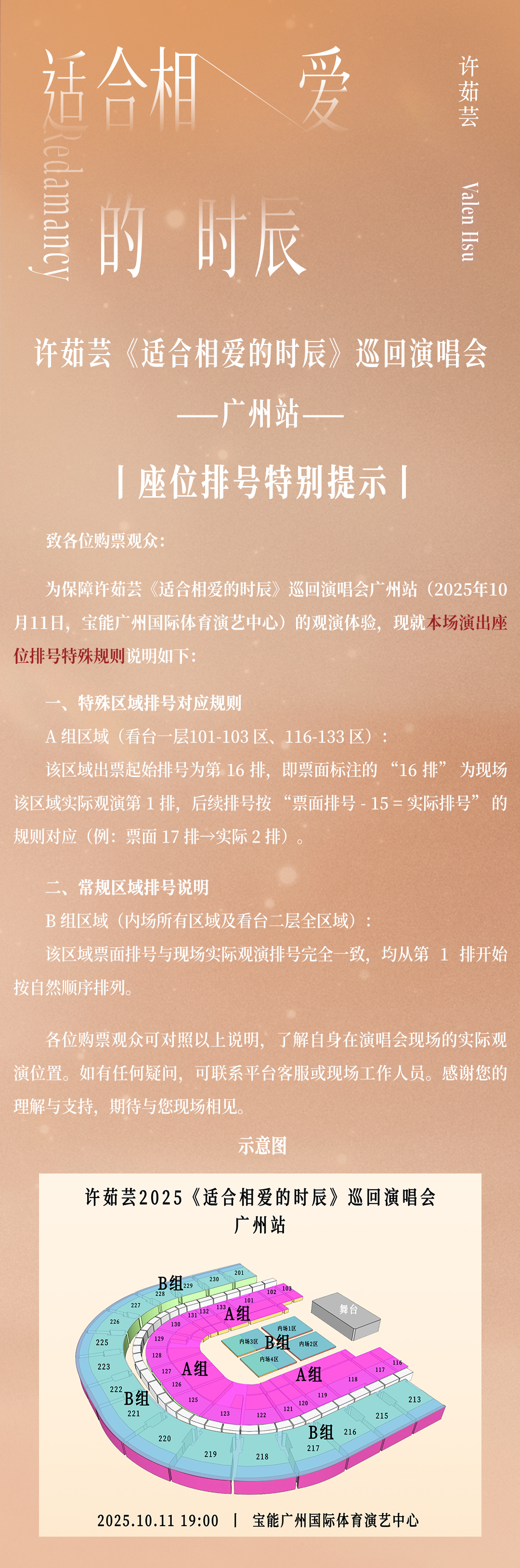 演出名称:【广州】许茹芸《适合相爱的时辰》巡回演唱会-广州站【网上订票】演出时间:2025.10.11 周六 19:00