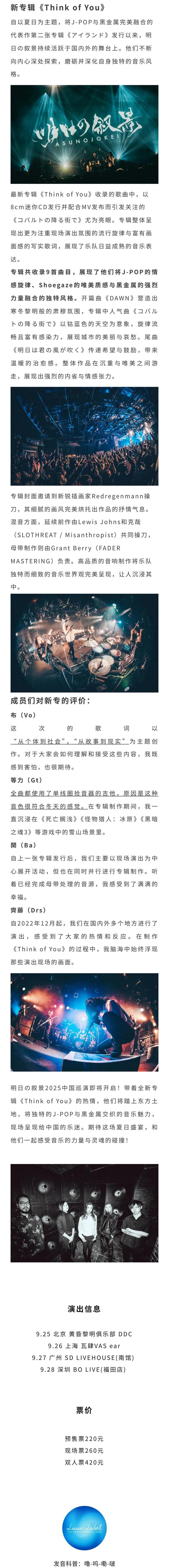 演出名称:【深圳】明日の叙景|日本黑金自赏核新专辑《Think of You》深圳站【网上订票】演出时间:2025.09.28 周日 20:00