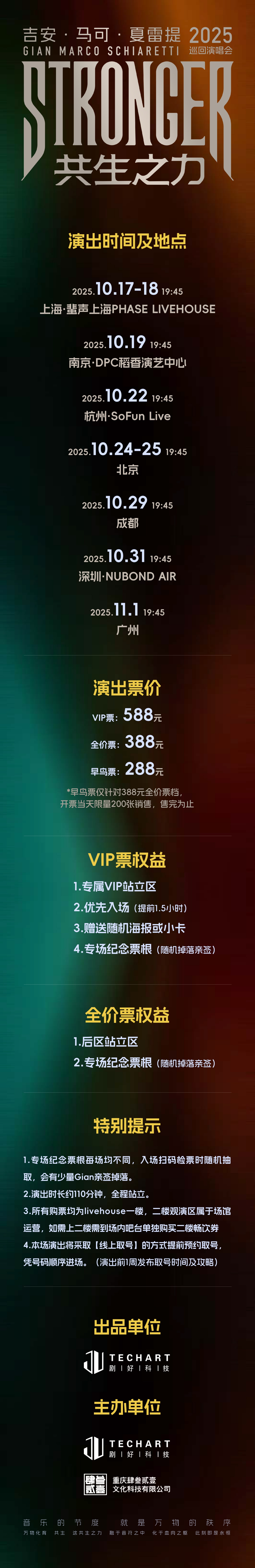 演出名称:【杭州】[STRONGBR共生之力] 吉安马可·夏雷提「2025」巡回演唱会 (杭州站)【网上订票】演出时间:2025.10.22 周三 19:45