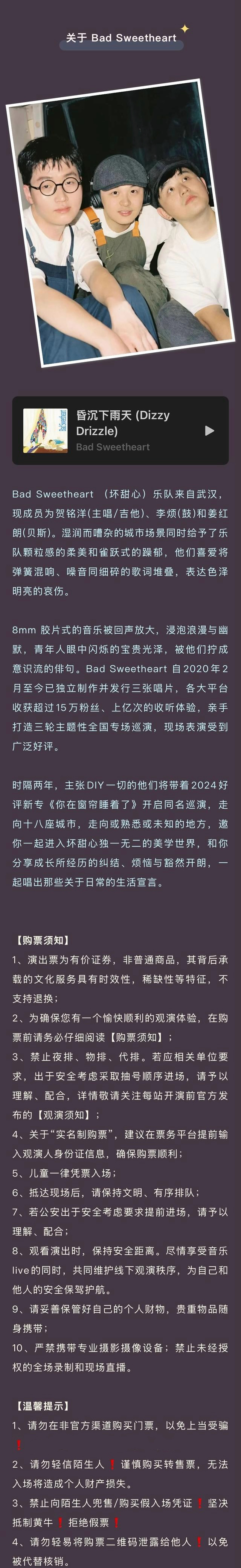 演出名称:【上海】Bad Sweetheart「你在窗帘睡着了」2025巡演 上海站【网上订票】演出时间:2025.12.06 周六 20:00