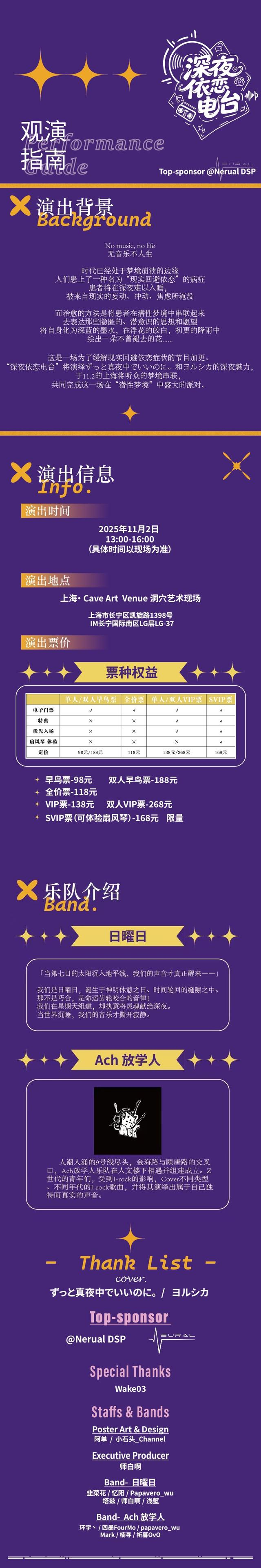 演出名称:【上海】1102|深夜依恋电台 - 真夜中&夜鹿 拼盘live【网上订票】演出时间:2025.11.02 周日 13:00