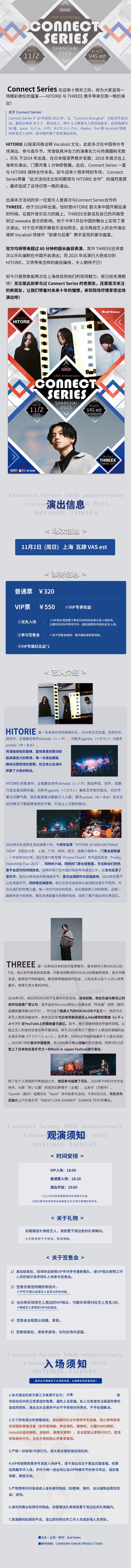 演出名称:【上海】Connect Series 10th anniversary 2025 上海站 HITORIE X THREEE【网上订票】演出时间:2025.11.02 周日 19:00