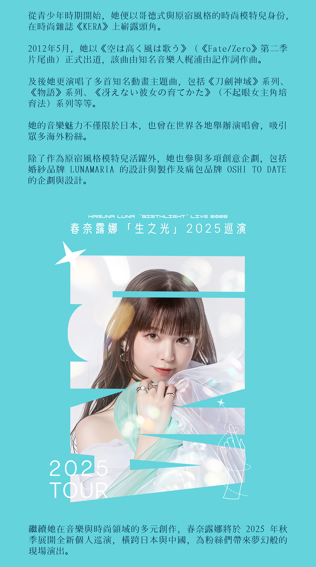 演出名称:【上海】春奈露娜 「生之光」2025巡演 上海站【网上订票】演出时间:2025.11.08 周六 19:30