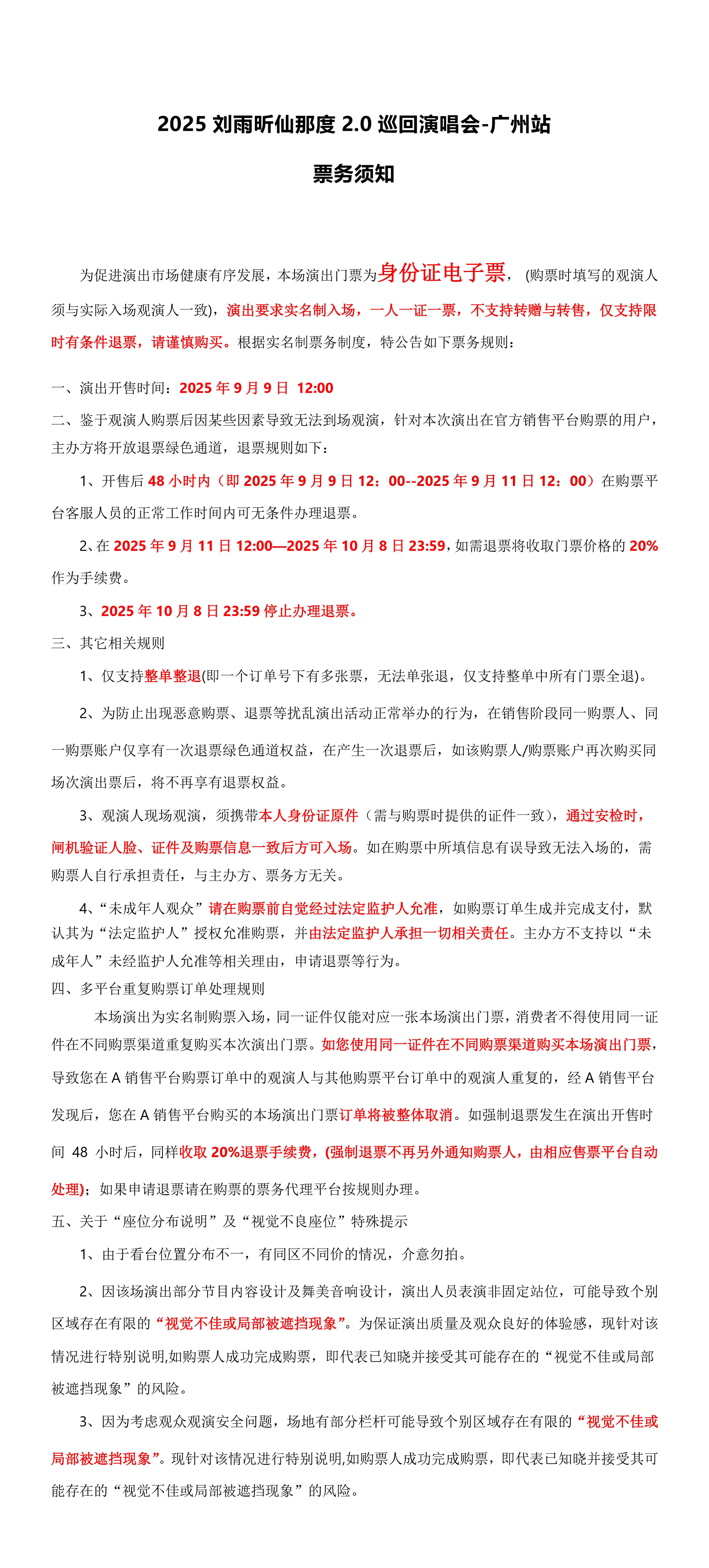 2025刘雨昕仙那度2.0演唱会-广州站预售期间产生的退票将于2025年9月21日11:00进行再次公开销售。此次售出的门票延用原退票规则。