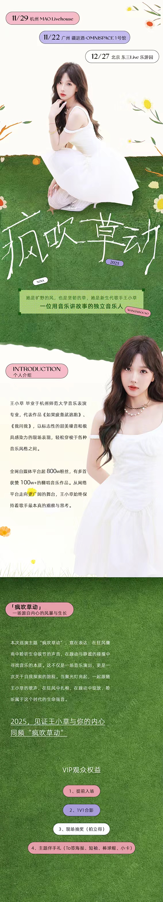 演出名称:【广州】广州王小草「疯吹草动」2025巡回演唱会【网上订票】演出时间:2025.11.22 周六 20:00