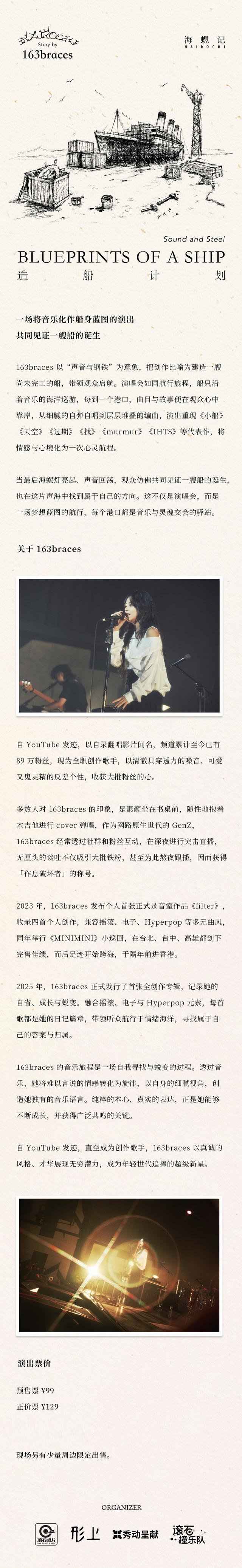 演出名称:【广州】163braces《海螺记》造船计划—专辑巡回演出 广州站【网上订票】演出时间:2025.11.09 周日 20:00