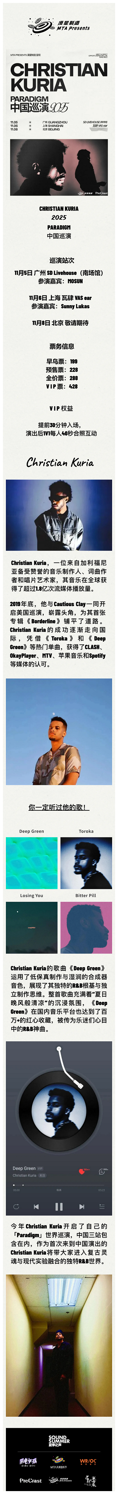 演出名称:【广州】Christian Kuria PARADIGM 巡演 2025 广州站 | 漠星制造呈现【网上订票】演出时间:2025.11.05 周三 20:00