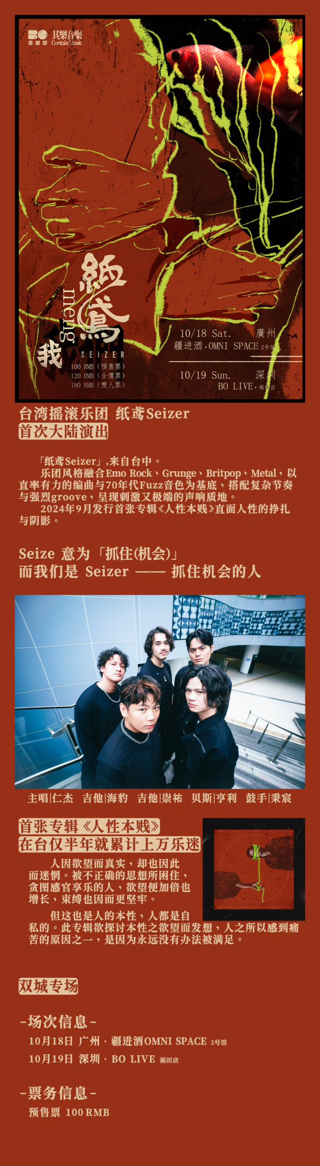 演出名称:【深圳】纸鸢Seizer「我們」2025 双城专场 深圳站【网上订票】演出时间:2025.10.19 周日 20:00