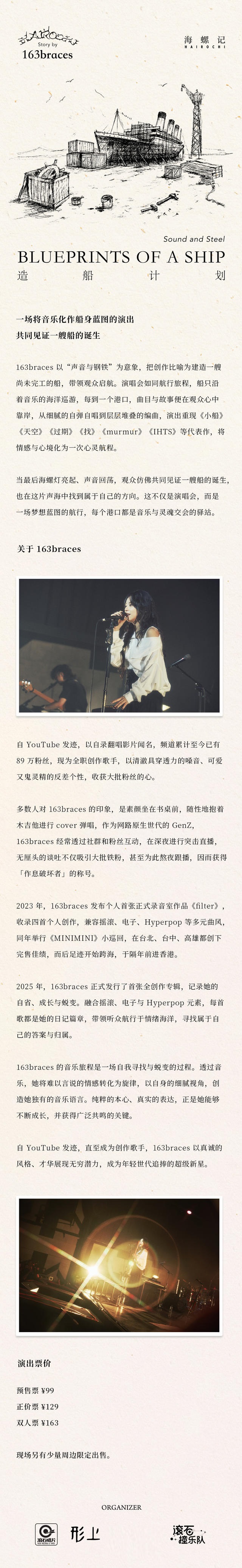 演出名称:【深圳】163braces《海螺记》造船计划—专辑巡回演出 深圳站【网上订票】演出时间:2025.11.07 周五 20:00