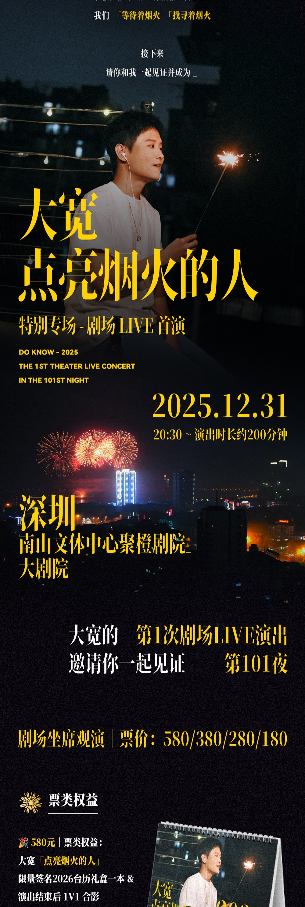 演出名称:【深圳】大宽 《点亮烟火的人》 特别专场-剧场LIVE首演【网上订票】演出时间:2025.12.31 周三 20:30