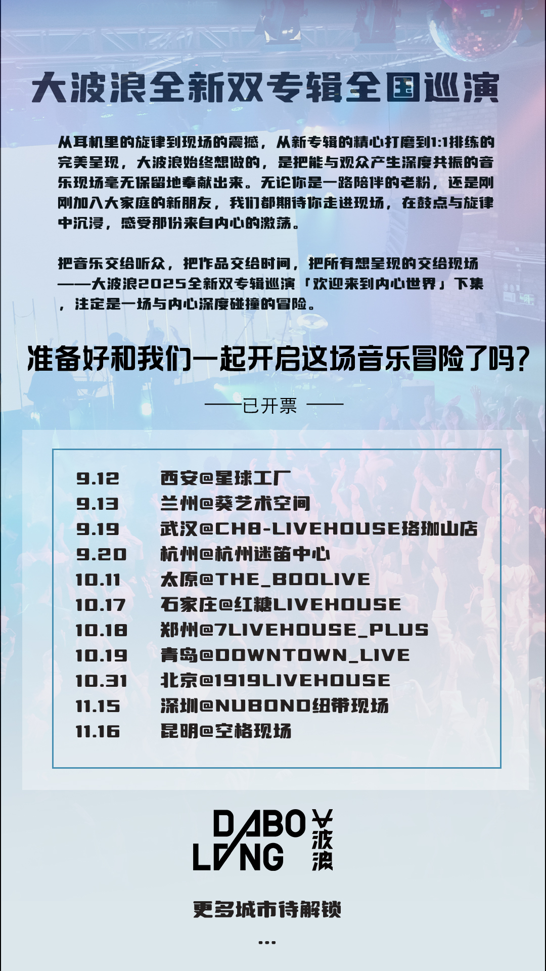 1、【深圳】大波浪「欢迎来到内心世界」2025巡演 深圳站【网上订票】门票多少钱?