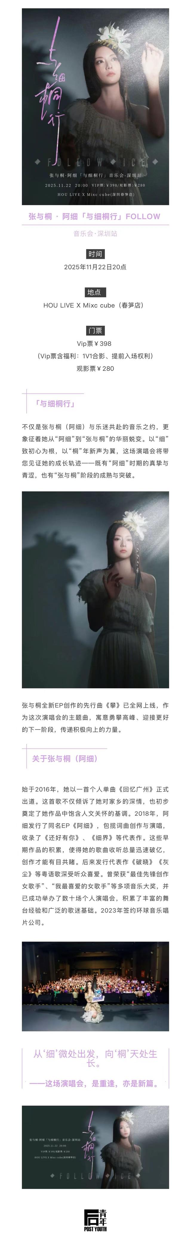 演出名称:【深圳】张与桐·阿细 与细桐行 音乐会深圳站【网上订票】演出时间:2025.11.22 周六 20:00