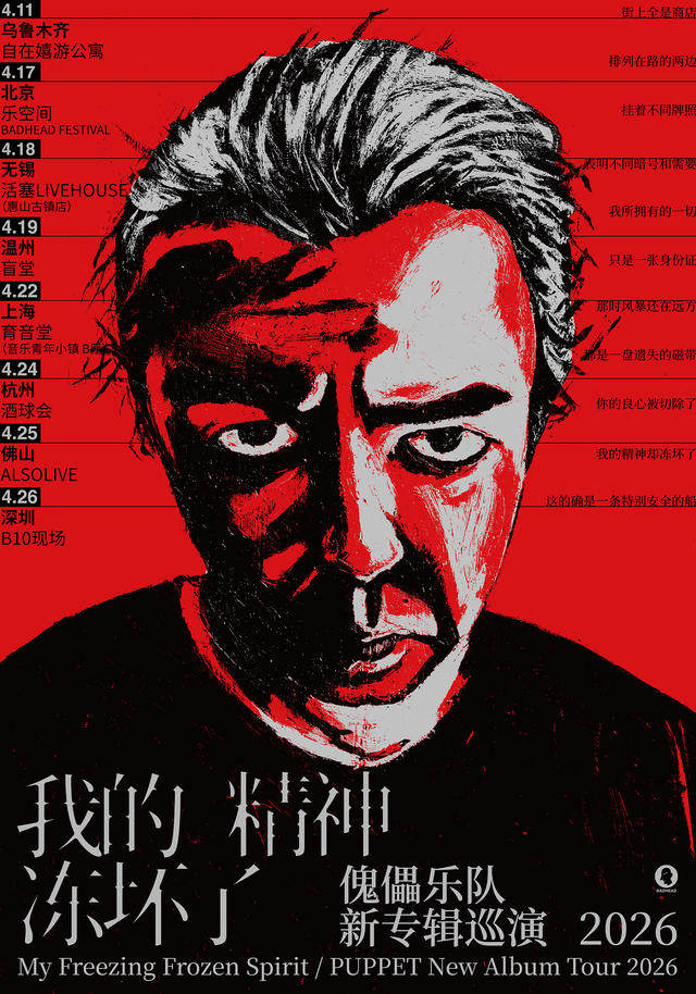 傀儡乐队新专辑《我的精神冻坏了》巡演开启 ! 4月11日在乌鲁木齐首发——自在嬉游公寓的开业庆典。随后奔赴北京参加BADHEAD厂牌的坏脑节,后将穿越无锡、温州、上海、杭州、佛山、深圳八城。