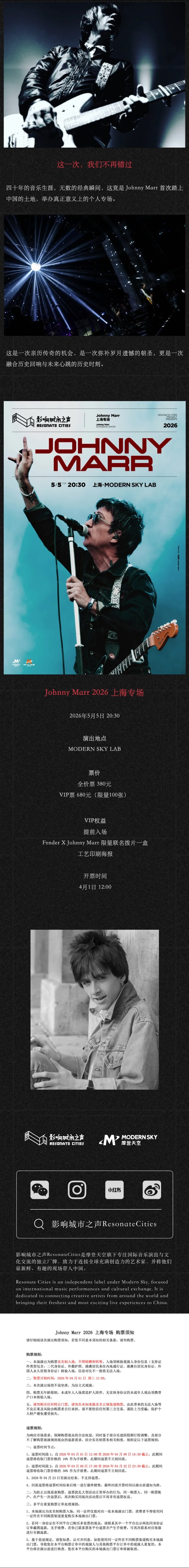 演出名称:【上海】Johnny Marr 2026 上海专场【网上订票】演出时间:2026.05.05 周二 20:30