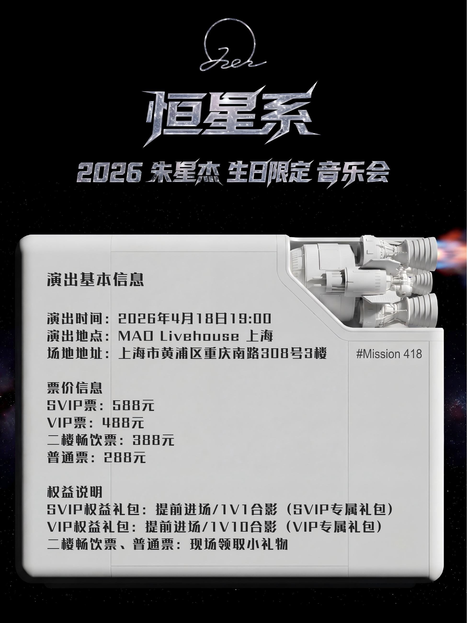 演出名称:【上海】2026朱星杰“恒星系”生日限定音乐会【网上订票】演出时间:2026.04.18 周六 19:00