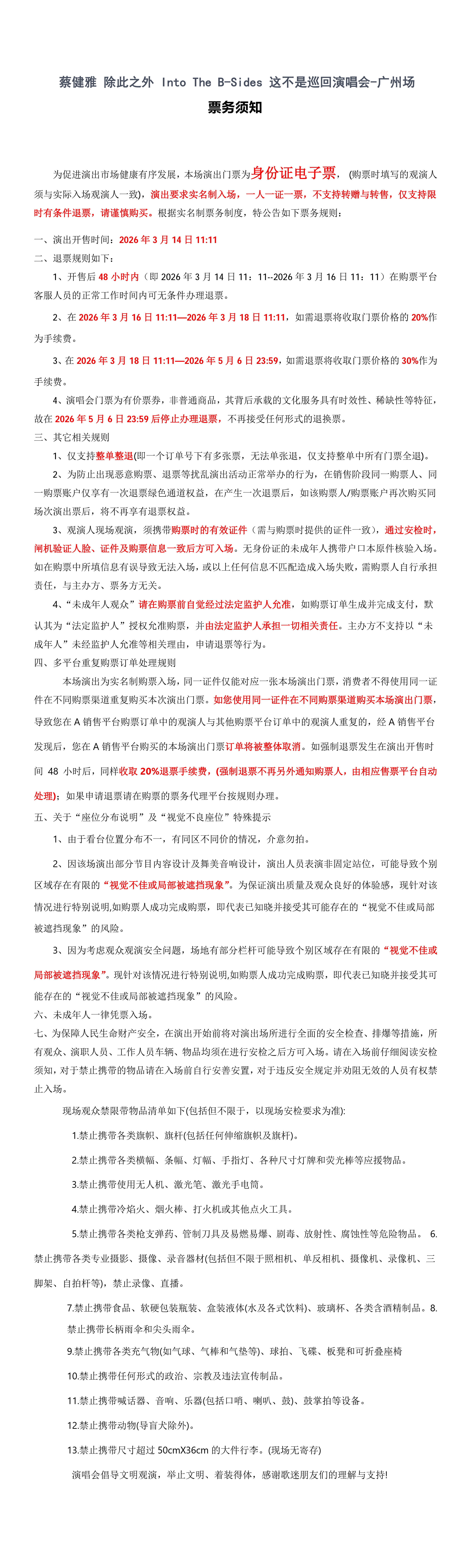 演出名称:【广州】蔡健雅 除此之外 Into The B-Sides 这不是巡回演唱会-广州场【网上订票】演出时间:2026.05.16 周六 19:00